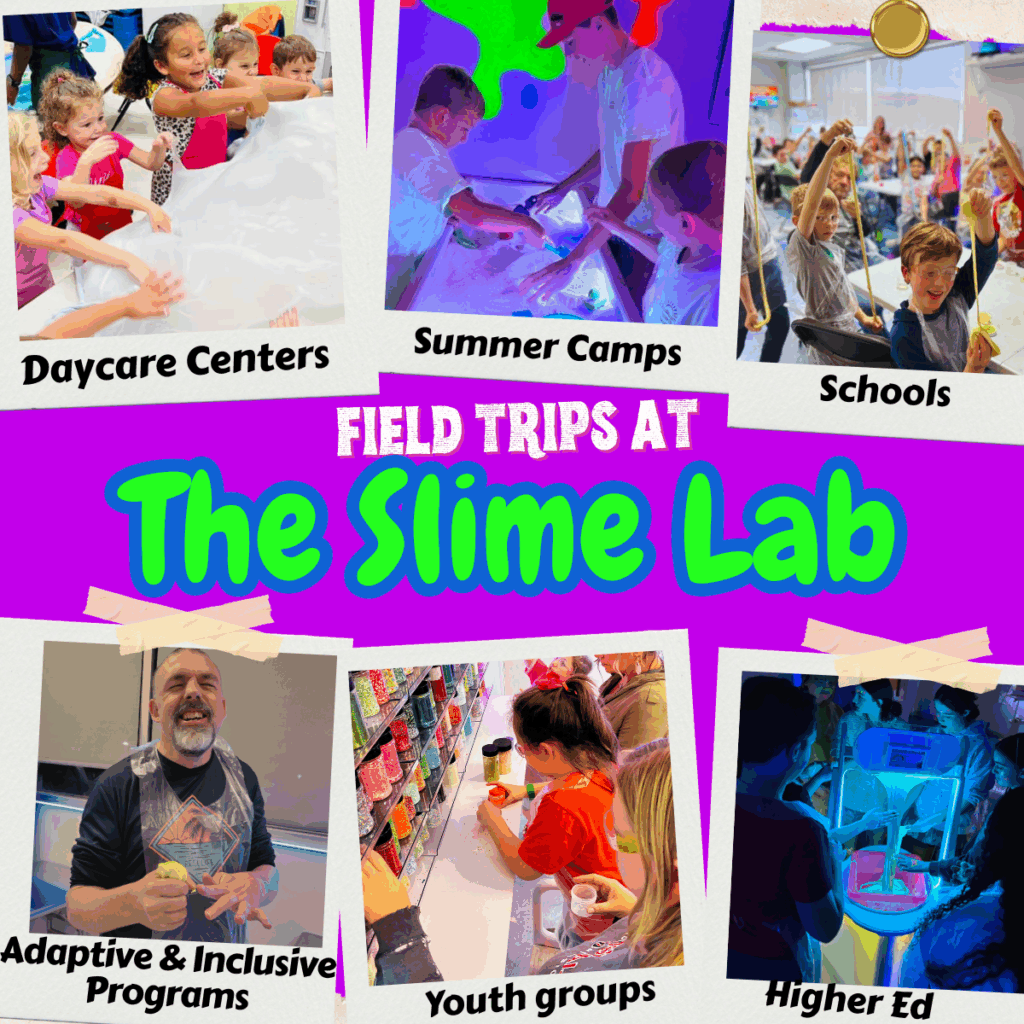 Our Slime Field Trips & Group Programs are designed for schools (k-12), daycare centers, summer camps, afterschool programs, colleges, special needs groups, and youth organizations — offering both on-site museum experiences and mobile workshops that bring the science and therapy of slime directly to you.
